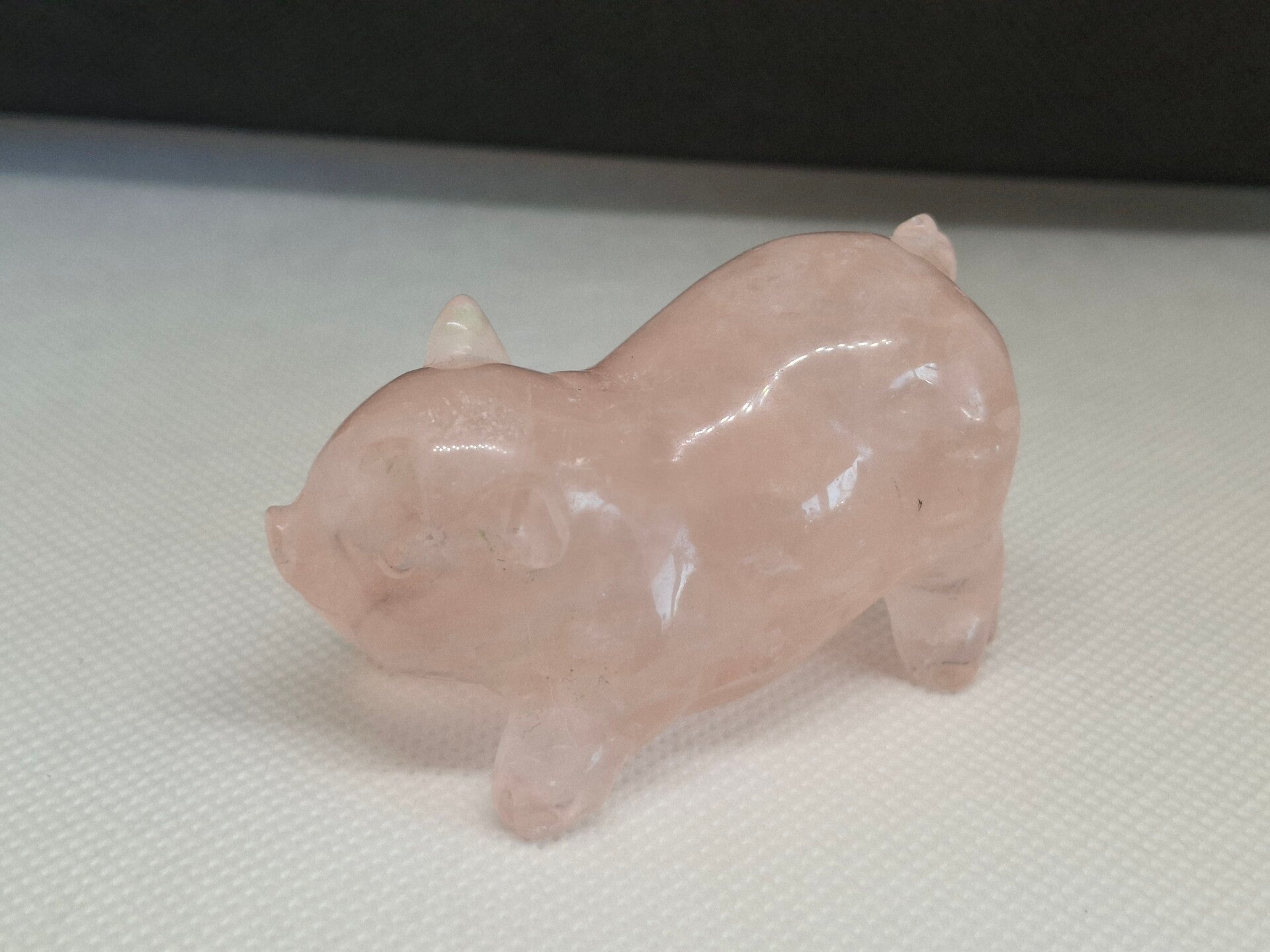 Dit speelse rosenkwarts varkentje is zo mooi gecarved!